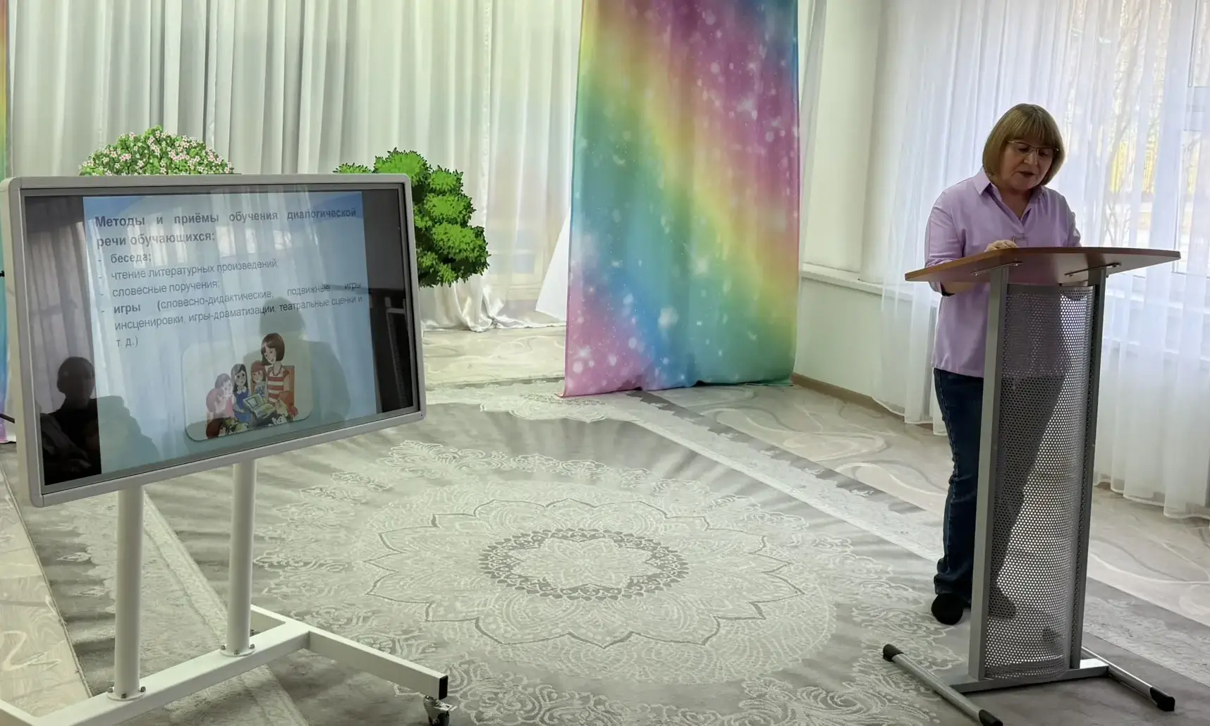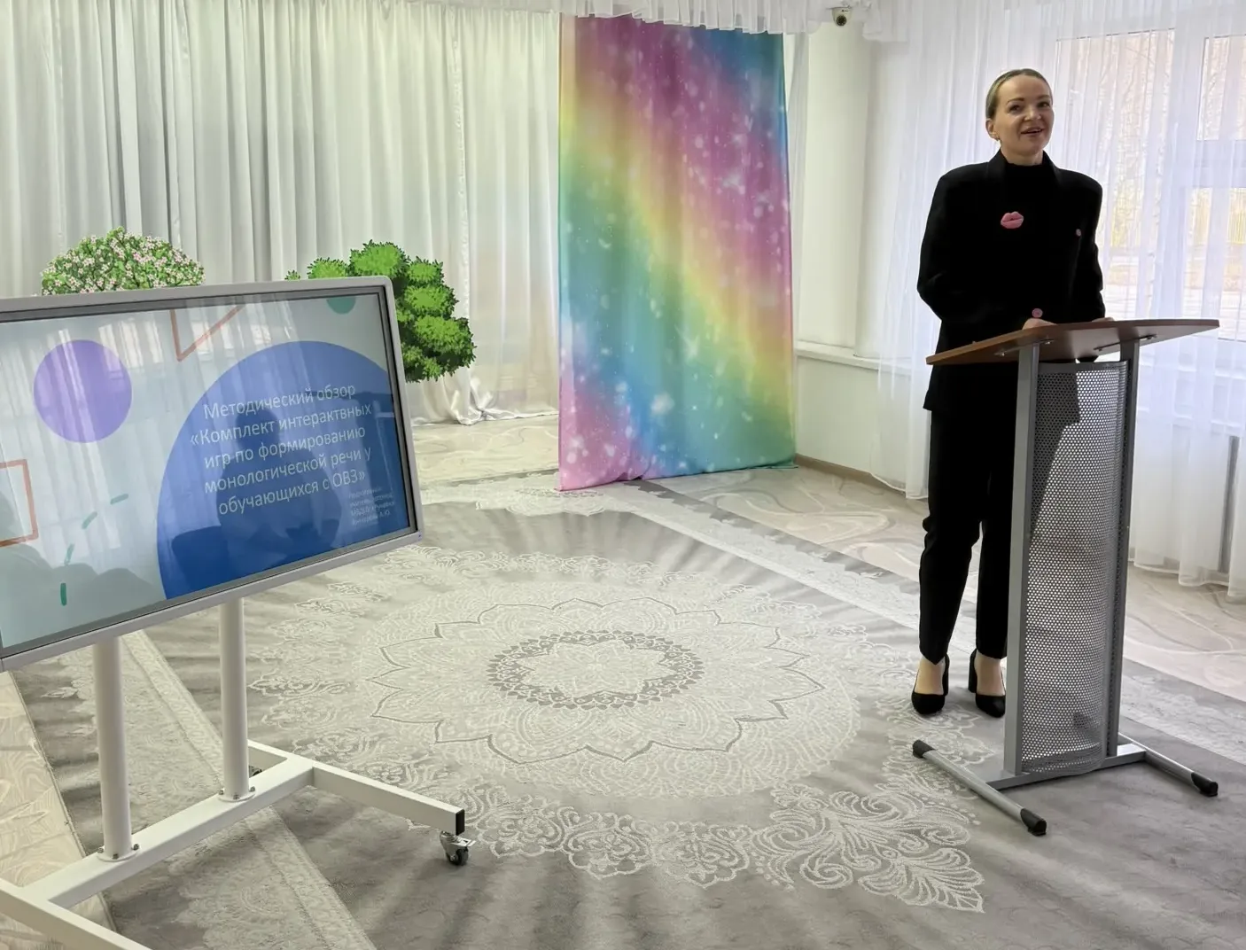 Гончарова А.Ю. познакомила коллег с «Комплектом интерактивных игр по формированию навыков монологической речи у обучающихся с ОВЗ». Используя в своей работе комплект интерактивных игр, можно отметить значимые положительные изменения в развитии связной речи за счет мощной зрительной опоры. Значительно расширяется словарный запас, большинство высказываний становятся правильно грамматически оформлены, обучающиеся активнее работают, дают уверенные ответы на поставленные перед ними задания, значительно уменьшается количество пауз в ответах. Большинство обучающихся уверенно строят предложения, удерживая их логику, составляют рассказы разного вида.
